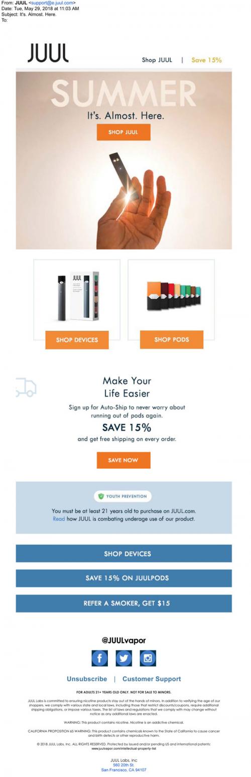 JUUL email from May 2018 celebrating the beginning of summer - almost. Provides links to shop devices and pods, and the benefits for signing up for their auto-ship program, as well as links to read about their Youth Prevention angle and how to get 15$ for referring a smoker.