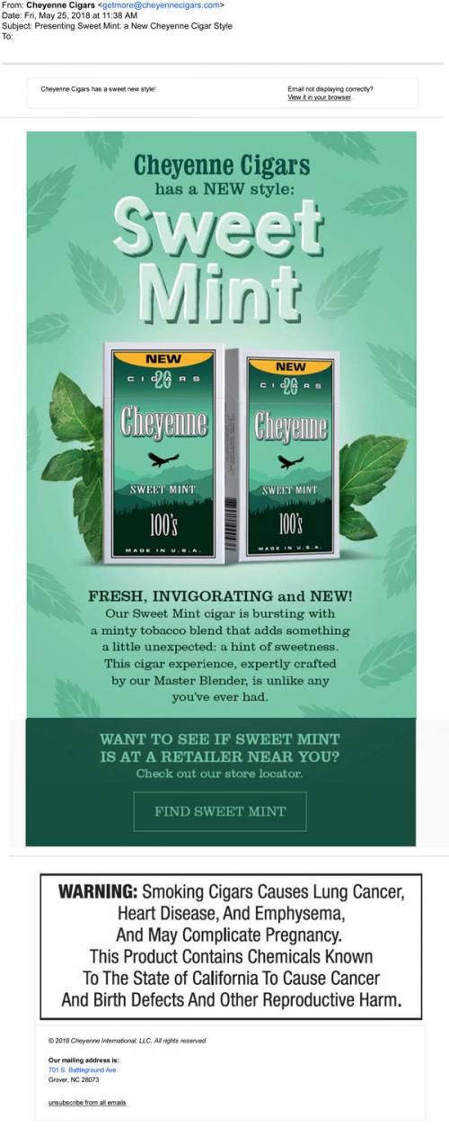 Email from Cheyenne cigars in May 2018 announcing a new 'sweet mint' flavor.