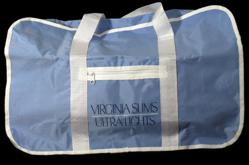 Light blue Virginia Slims Ultra Lights diffel bag with white trim and zippers.
