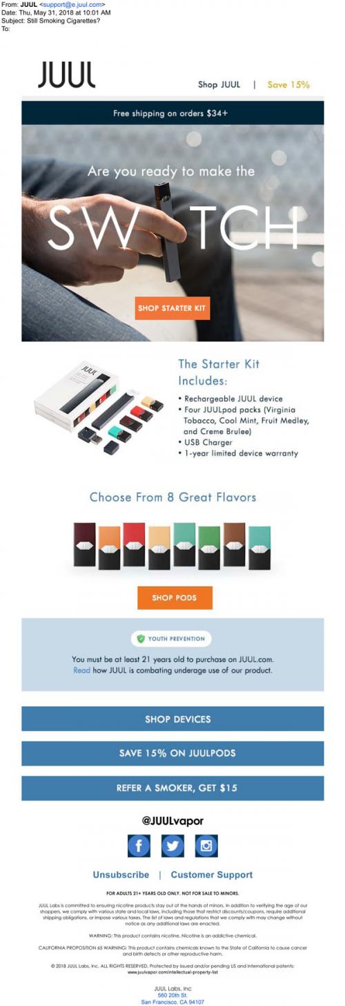 JUUL email from May 2018 promoting their starter kit product as a tool to use when switching from combustible cigarettes; shows a line up of the different flavors available. Also links to their Youth Prevention program, the auto-ship ordering system, and the smoker referral promo.