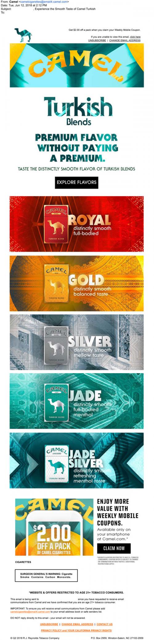 Email from Camel in June 2018 promoting the Turkish Blends products. Provides a link to the brand website to learn more about the flavors available. Also includes a link to claim weekly mobile coupons.