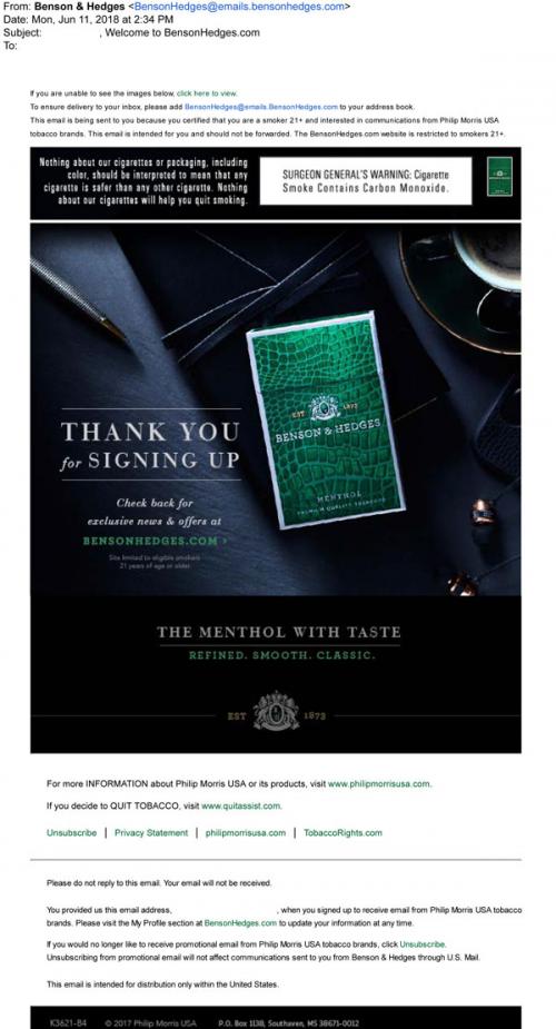 Email from Benson & Hedges in June 2018 thanking the recipient for signing up on the brand website. Highlights their menthol product.