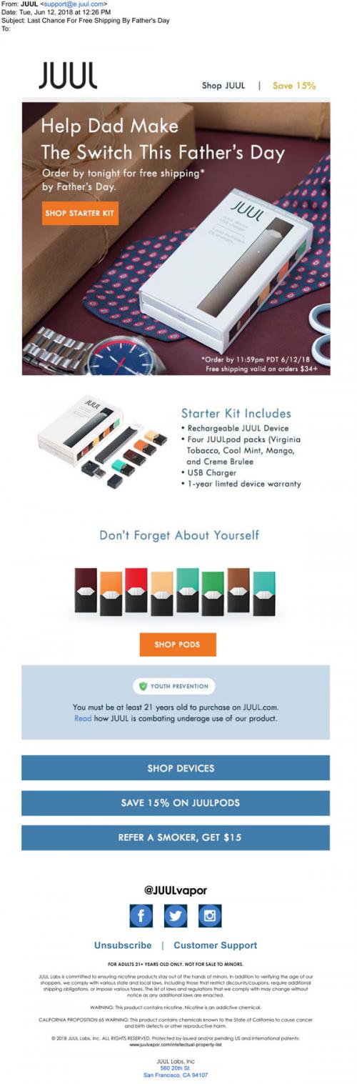 Email from JUUL in June 2018 promoting their products to "help dad make the switch this Father's Day." Provides links to check out starter kits and flavored pods. Also links to the Youth Prevention program, and to learn more about the auto-ship savings and the smoker referral bonus.