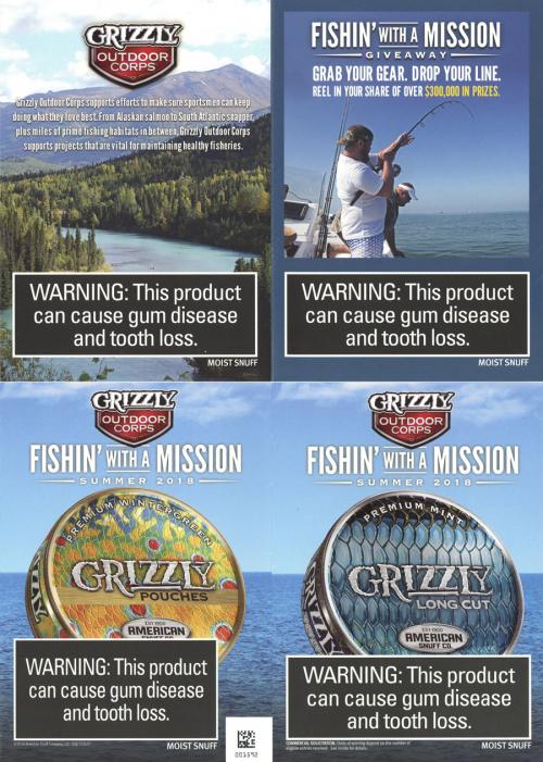 Direct mail from Grizzly received in June 2018 promoting the Fishin' With A Mission giveaway. The envelope is patterned like fish scales and includes images of the limited edition fish cans. The booklet has pictures of possible prizes to win, coupons, and descriptions of the fishing conservation projects going on through the brand website. Also mentions the availability of mobile coupons.