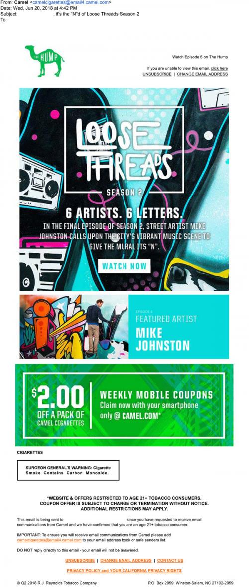 Camel email from June 2018 promoting the season 2 finale of the Loose Threads series, available to watch on the brand website. Also links to claim weekly mobile coupons.