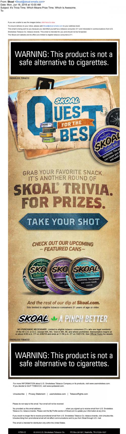 Email from Skoal in June 2018 promoting the Quest for the Best trivia sweepstakes. Links to enter and to check out the new can designs on the brand website.