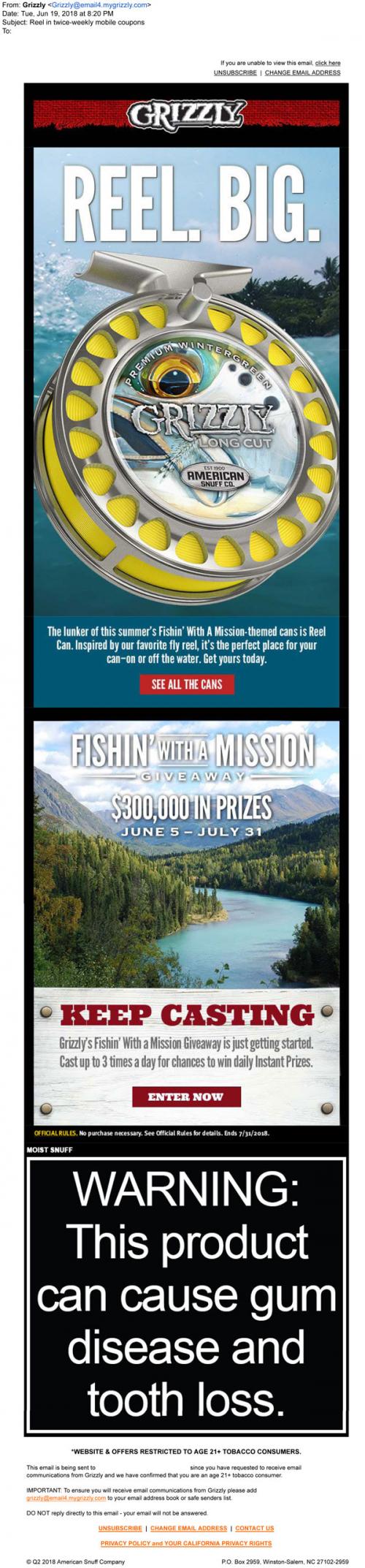 Email from Grizzly in June 2018 promoting the Fishin' With A Mission giveaway, with a link to the brand website to enter. Also promotes the limited edition tie-in cans that are available to purchase, like the special reel can.