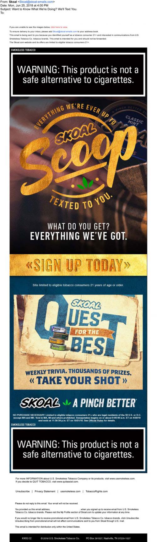 Skoal email from June 2018 promoting their "Skoal Scoop" program, where the brand will text customers updates about what's going on online; provides a link to the brand website to sign up. Also includes a promotion for the Quest for the Best trivia sweepstakes.