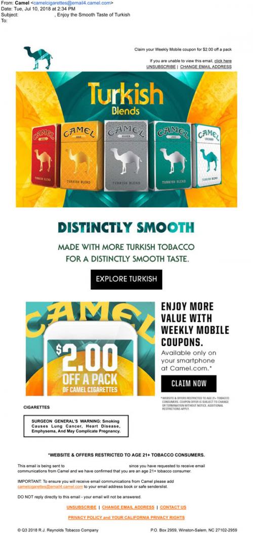 Email from Camel in July 2018 promoting the Turkish blends and weekly mobile coupons.