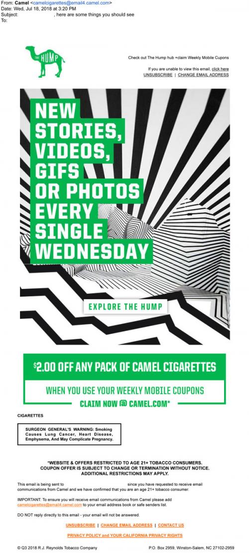 Camel email in July 2018 promoting their weekly wacky feature The Hump on the brand website. Also links to claim mobile coupons.