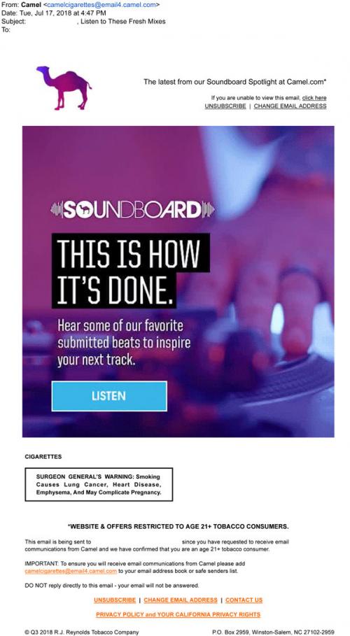 Camel email in July 2018 promoting the interactive Soundboard on the brand website and some submitted music tracks to inspire future creations.