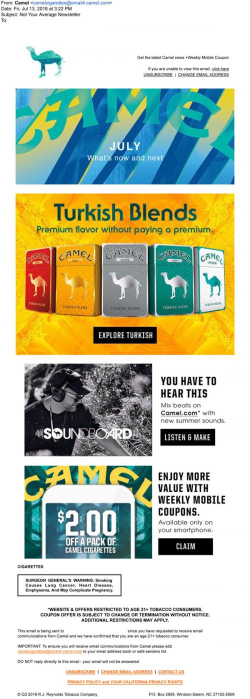 Email newsletter from Camel in July 2018 promoting their Turkish blends, new beats on the Soundboard to try, and weekly coupons available to claim.