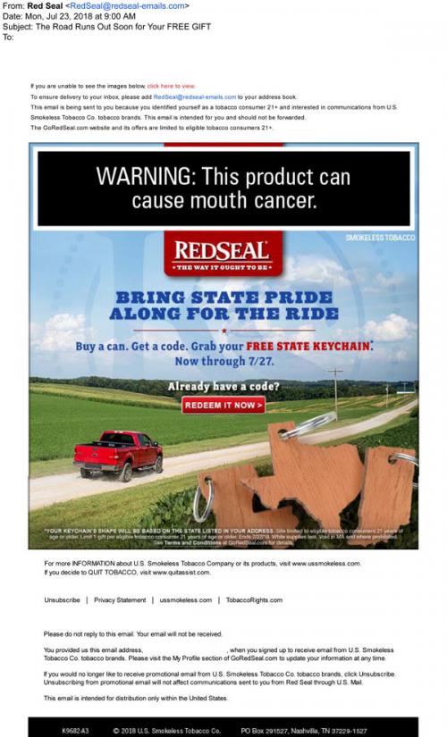 Red Seal email from July 2018 with a reminder to buy a can to get a promo code to claim a free state keychain on the brand website.