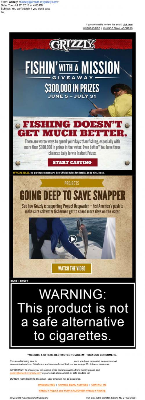 Email from Grizzly in July 2018 promoting the Fishin' With A Mission giveaway, with a link to the brand website to enter. Also links to a video about a FishAmerica collaboration to conserve fish for sport fishermen.