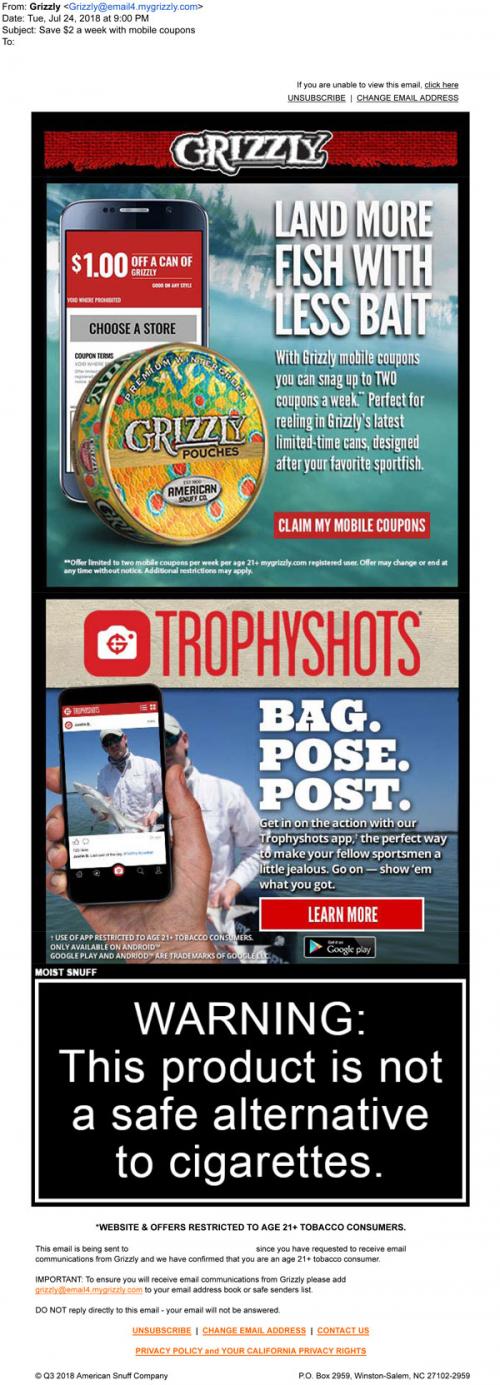 Email from Grizzly in July 2018 linking to claim available weekly coupons from the brand website. Also promotes the TrophyShots app, available through the website or Google Play.