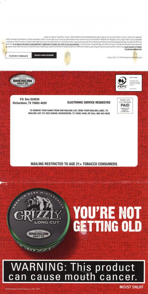 Direct mail from Grizzly received in July 2018 wishing the recipient a happy birthday, with an included coupon and a reminder to claim weekly coupons on the brand website. Text: "You're not getting old, you're getting more vintage."
