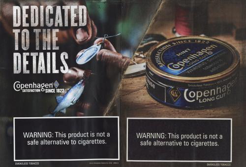 2-page magazine ad promoting Copenhagen's mint product. Imagery includes a can on a workbench and a fishing lure being threaded by dirty, masculine hands. Text: "Dedicated to the details."