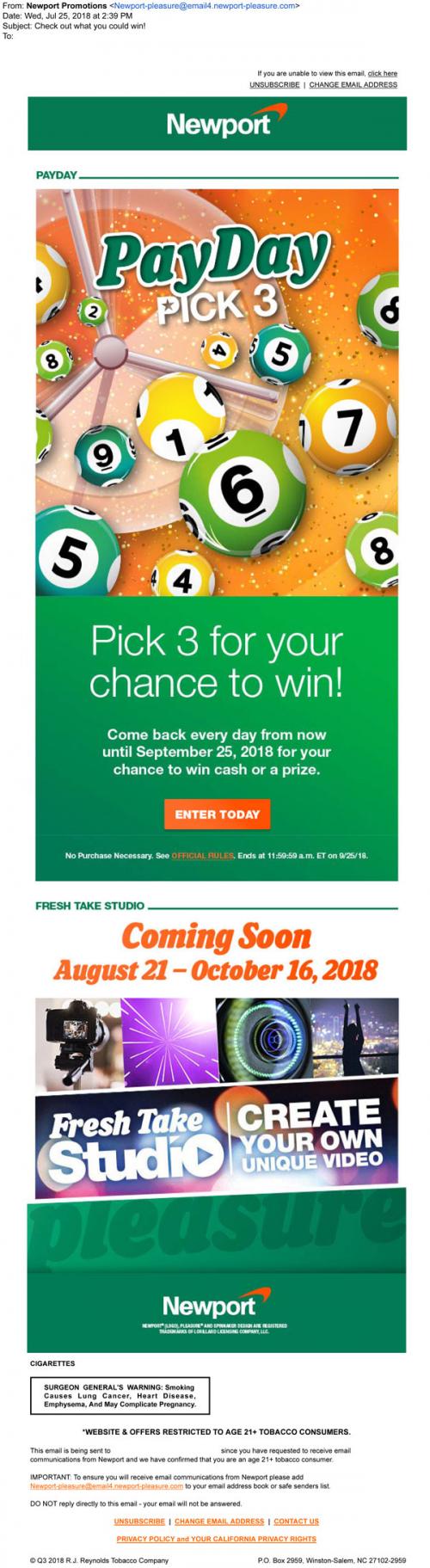 Email from Newport in July 2018 promoting the PayDay Pick 3 sweepstakes, with a link to enter on the brand website, and an upcoming new video creation tool from the Fresh Take Studio.
