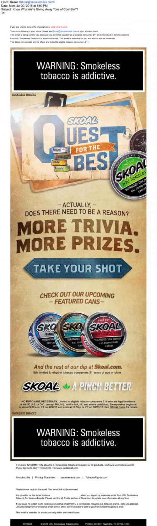 Skoal email from July 2018 promoting the Quest for the Best trivia sweepstakes, with a link to enter on the brand website. Also recommends checking out the featured cans and other dip flavors.
