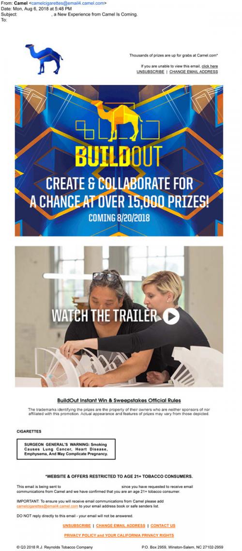Email from Camel in August 2018 announcing an upcoming sweepstakes called BuildOut, for creating and collaborating for the chance to win prizes.