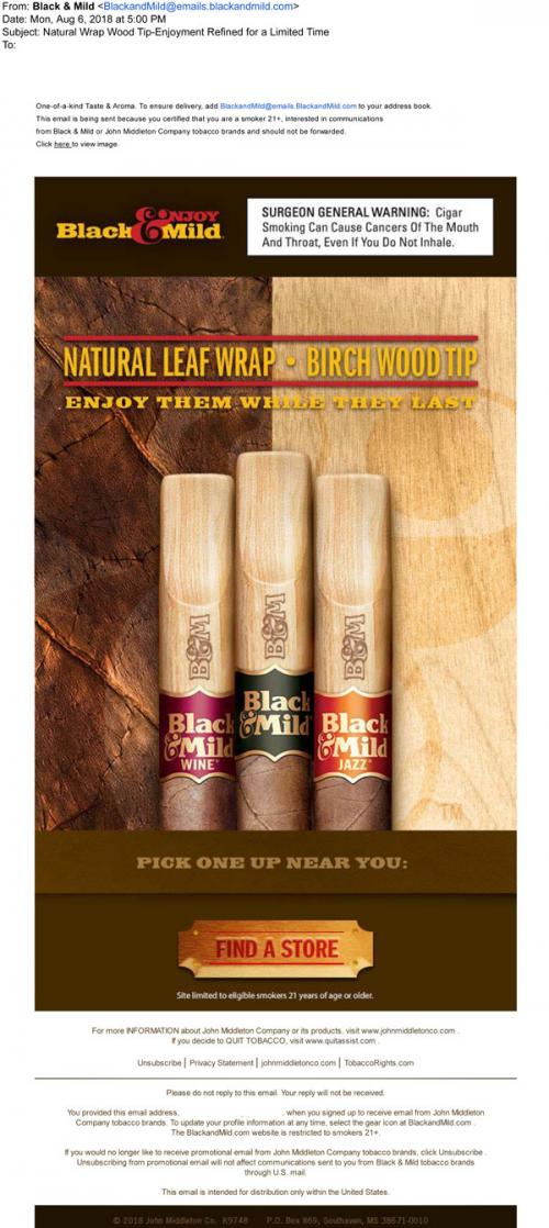Email from Black & Mild in August 2018 promoting the limited time natural leaf wrap and birch wood tip product, with a link to the brand website to find a nearby retail location that offers them.
