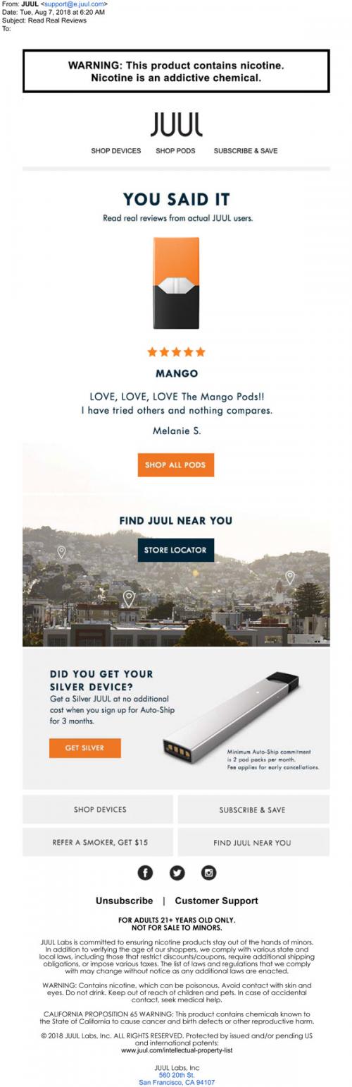 Email from JUUL in August 2018 featuring reviews from users of the product, with images of the different pod flavors. Reminds the recipient to get a free silver device with subscription to the auto-ship program. Links to shop, use a store locator, take advantage of the smoker referral program for store credit.