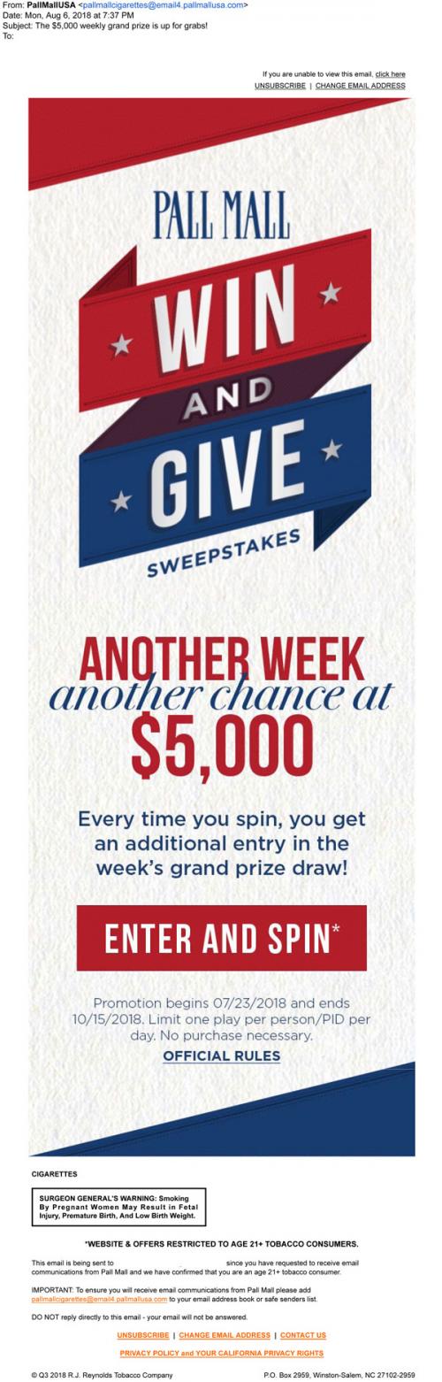 Email from Pall Mall in August 2018 promoting the Win And Give sweepstakes, with a link to the brand website to enter, and a reminder about how the brand is donating to help veterans.
