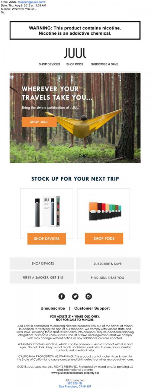 JUUL email in August 2018 promoting their products as travel accessories. Links to the online shop to purchase, learn more about their auto-ship program and smoker referral program, and use a store locator.
