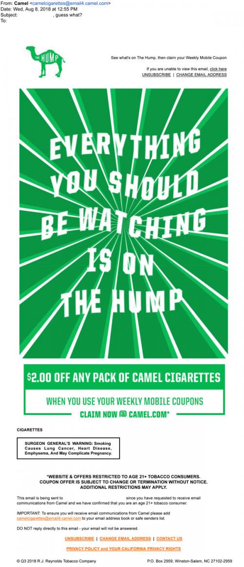 Email from Camel in August 2018 promoting their video series on The Hump feature on the brand website. Also reminds the recipient to claim weekly mobile coupons.