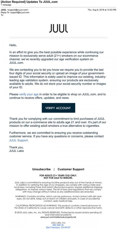 Email from JUUL in August 2018 informing the recipient about upgrades made to the age verification system on the brand website. Provides a link to verify the customer's age in order to be able to shop online and receive future offers, updates, and news via email.