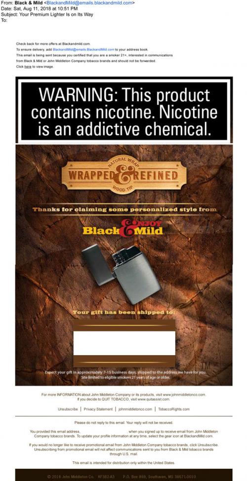 Email from Black & Mild in August 2018 thanking the recipient for claiming a lighter celebrating their natural wrap and wood tip product. Announces that the lighter has been shipped to the address the brand has on file.