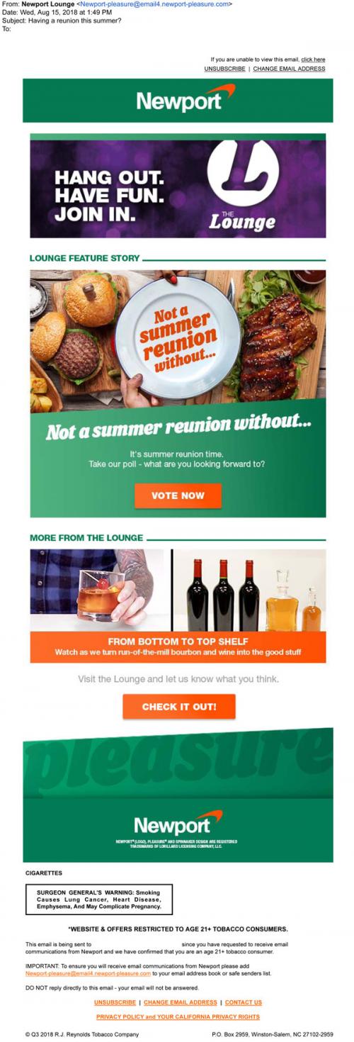 Email from Newport in August 2018 promoting current articles on The Lounge section on the brand website, inviting the recipient to participate in a poll about summer reunion necessities, or read an article about alcohol.