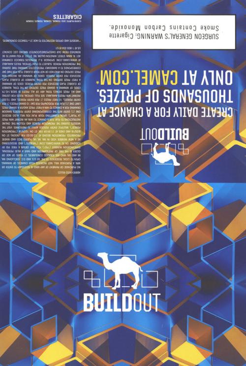 Direct mail from Camel received in August 2018 promoting the BuildOut sweepstakes. Describes how to use the online tools on the brand website to build 3D structures, add your piece to a community design, and inspire artists to build them in real life. Reminds the recipient to enter daily for more chances to win. Includes some images of possible grand prizes, coupons, and a reminder to claim weekly mobile coupons from the website.