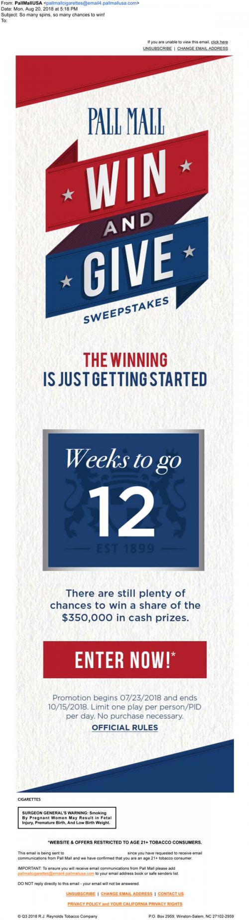 Email from Pall Mall in August 2018 promoting the start of the Win and Give sweepstakes. Provides a link to the brand website to enter.