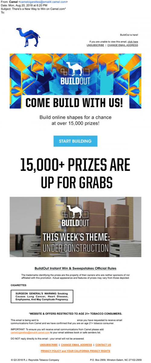 Email from Camel in August 2018 inviting the recipient to participate in the BuildOut sweepstakes under a different theme each week. Links to the brand website to enter.