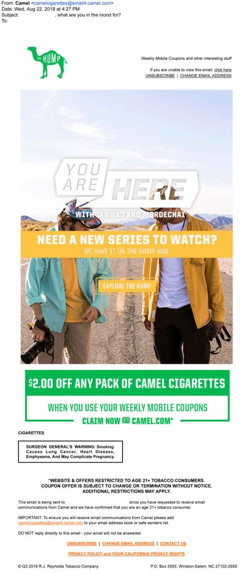 Email from Camel in August 2018 promoting the new You Are Here series on the Hump feature, available to watch on the brand website. Has an animated GIF that shows different locations that the hosts visit during the show. Also includes a link to claim weekly mobile coupons.