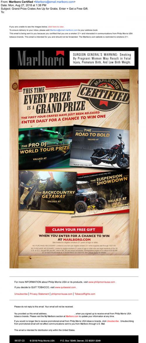 Email from Marlboro in August 2018 promoting the Marlboro Certified sweepstakes. Includes a link to claim a free gift when you enter to win through the brand website. Also shows images of various prizes that can be won.