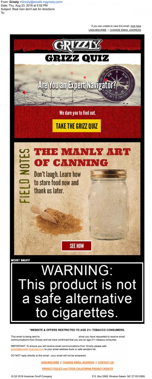 Email from Grizzly in August 2018 promoting a recent Grizz Quiz about navigation skills (because "Real men don't ask for directions") and linking to a how-to Field Notes article about "the manly art of canning."