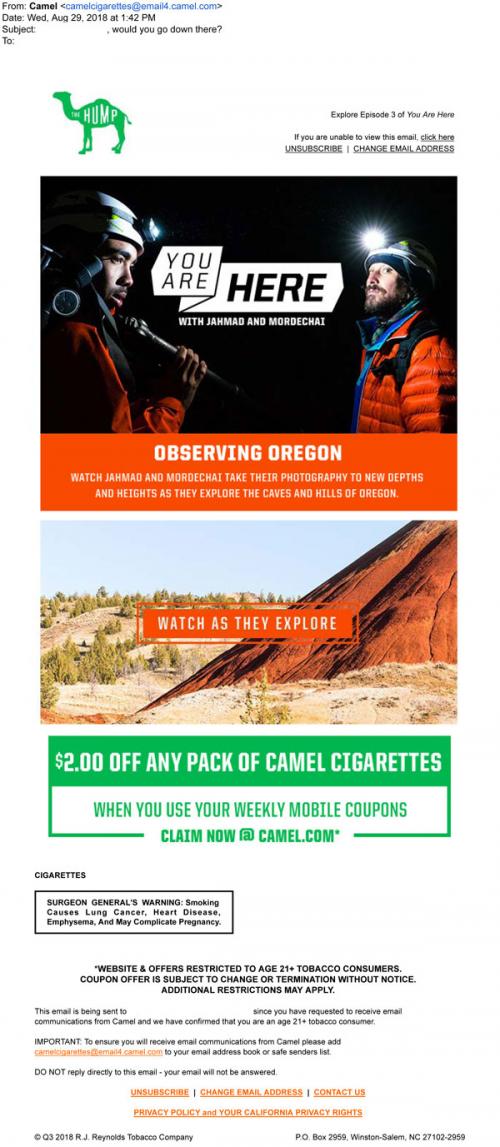 Email from Camel in August 2018 promoting the You Are Here video series on The Hump. Also links to claim weekly mobile coupons.