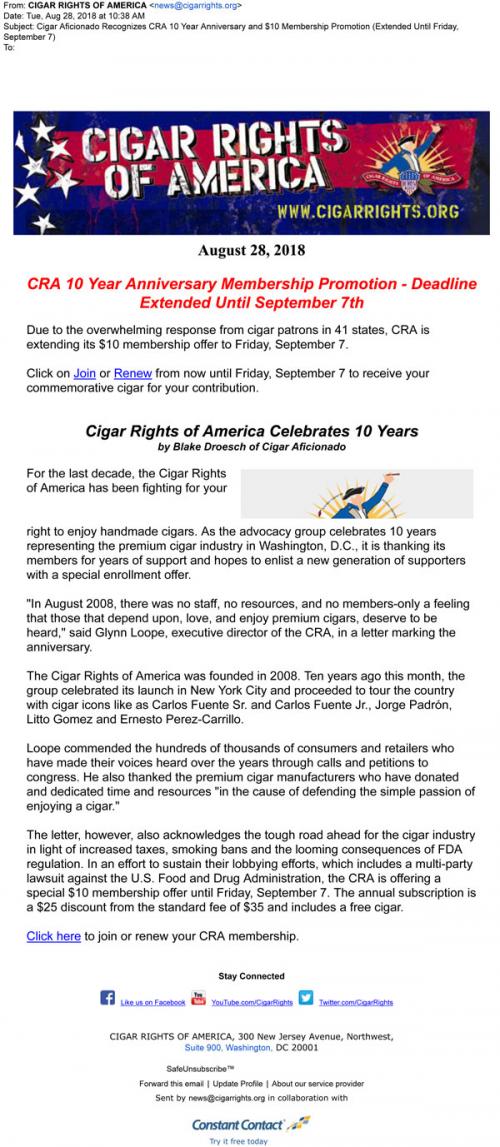Email from the Cigar Rights of America in August 2018 promoting their 10th anniversary with a membership discount to help them continue to promote pro-premium cigar legislation. Includes an offer for a free commemorative cigar with a new or renewed membership.