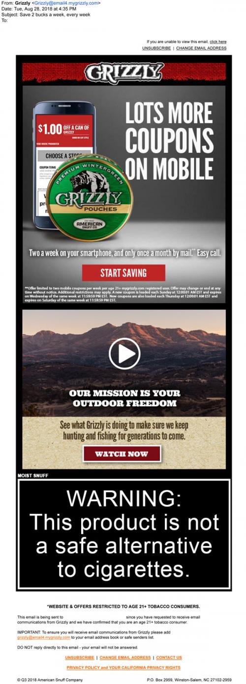 Email from Grizzly in August 2018 promoting weekly mobile coupons as a better choice over monthly direct mail coupons. Also links to watch a video on the brand website about their environmental, pro-hunting mission.