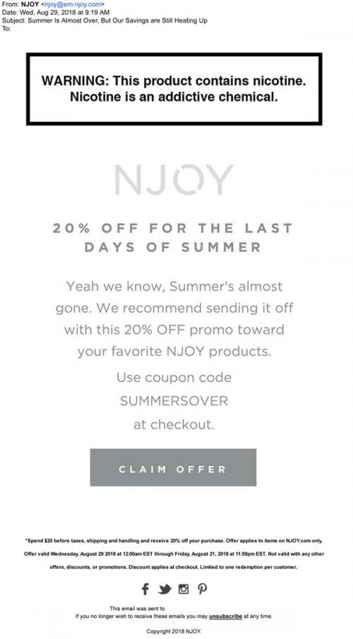 NJOY email from August 2018 promoting an end of summer coupon code for use on the brand website.