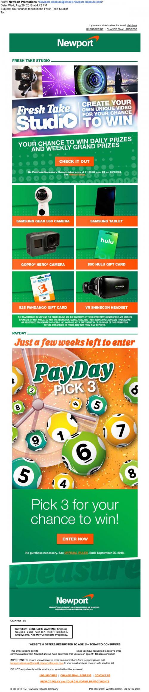 Email from Newport in August 2018 promoting the Fresh Take Studio, where contestants can create videos for a chance to win prizes, and the PayDay Pick 3 game that can also be entered on the brand website.