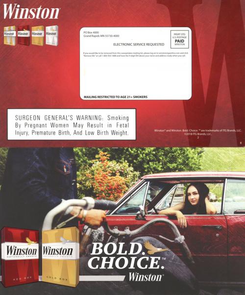 Direct mail from Winston received in June 2018 promoting the Let It Ride sweepstakes, and delivering coupons. Has imagery of men and women in cars and on motorcycles. Includes instructions for claiming direct mail coupons on the brand website. Copy reads, "Worry about tomorrow, tomorrow." and "To win it all, you have to chance it all."