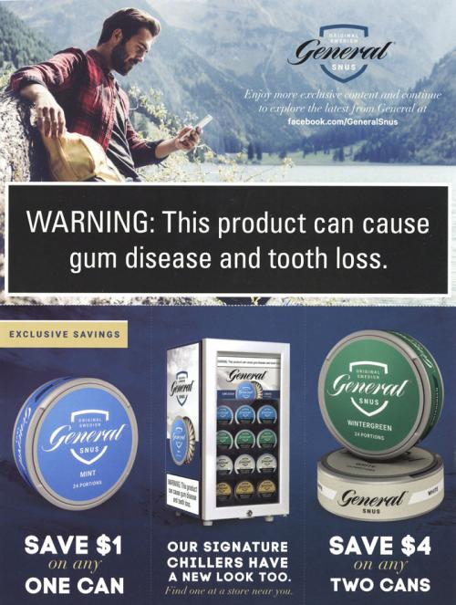 Direct mail from General Snus received in September 2018 that consists of a folded piece including coupons, and a piece shaped like a line of their new can designs, with descriptions of each flavor written on the back. Includes nearby retail locations to purchase their products.