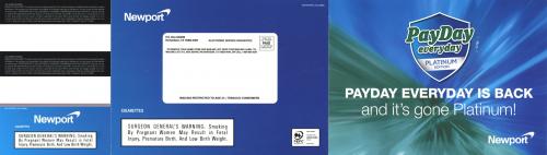 Direct mail from Newport received in February 2018 announcing the return of the PayDay Everyday sweepstakes, with an invitation to play on the brand website. Describes how to enter, different amounts of money you can win, and includes coupons. Also has a reminder to claim mobile coupons on your phone.