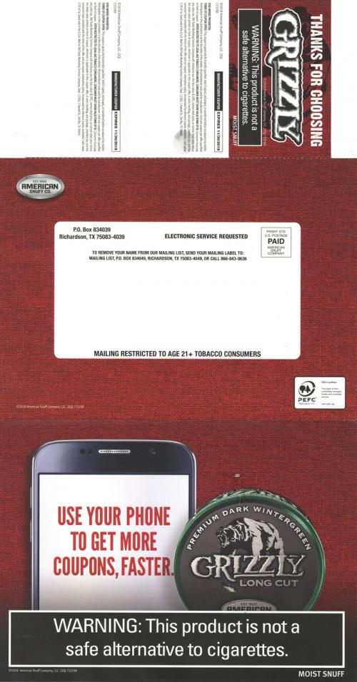Direct mail from Grizzly received in September 2018 that promotes the weekly mobile coupons that are available to claim, as much faster than waiting for mail coupons. Promotes pouches and long cut styles. Includes coupons.