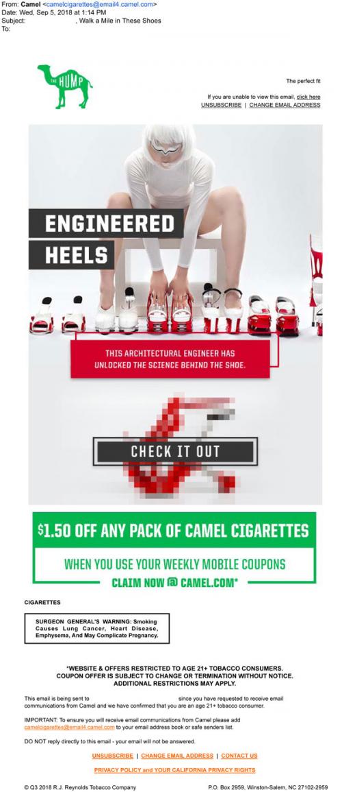 Email from Camel in September 2018 linking to a new article on The Hump feature about engineered heels. Also reminds the recipient to claim a weekly mobile coupon through the brand website.