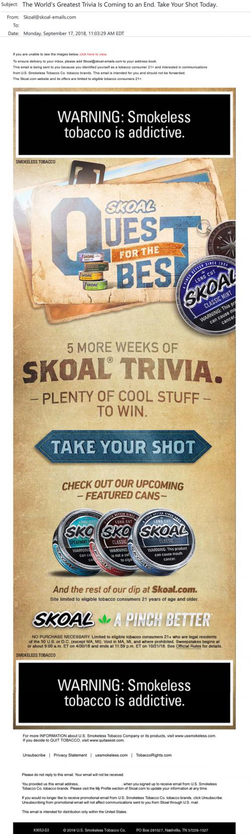 Skoal email received in September 2018 announcing 5 more weeks of the Quest for the Best trivia sweepstakes, with a link to enter on the brand website and check out their upcoming featured flavors and styles.