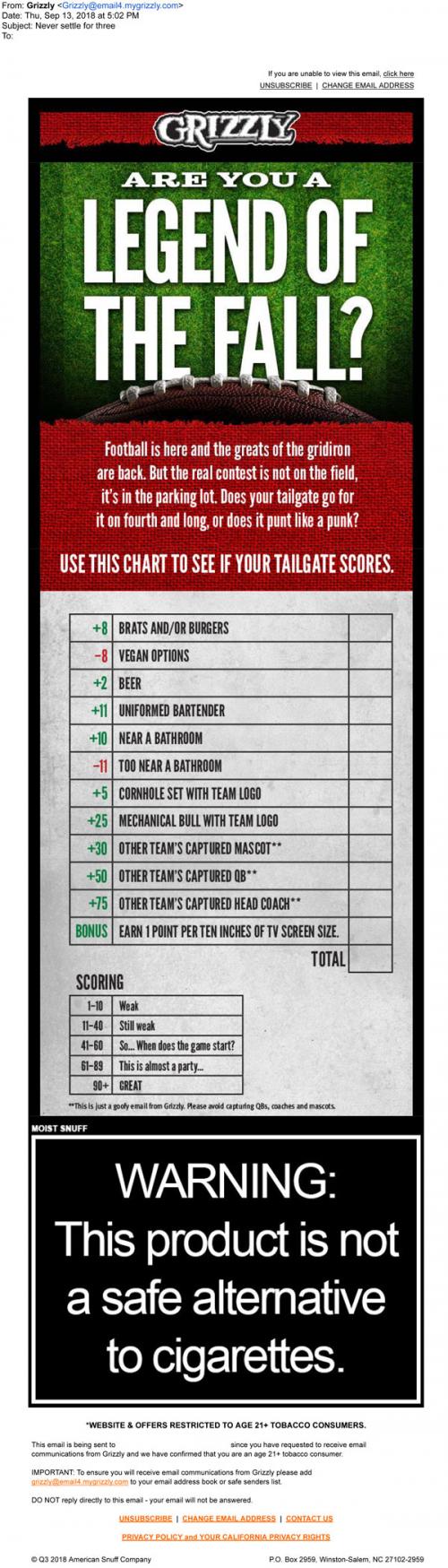 Email from Grizzly in September 2018 with a fun chart to judge your football tailgate party. Text: "Are you a legend of the fall?"